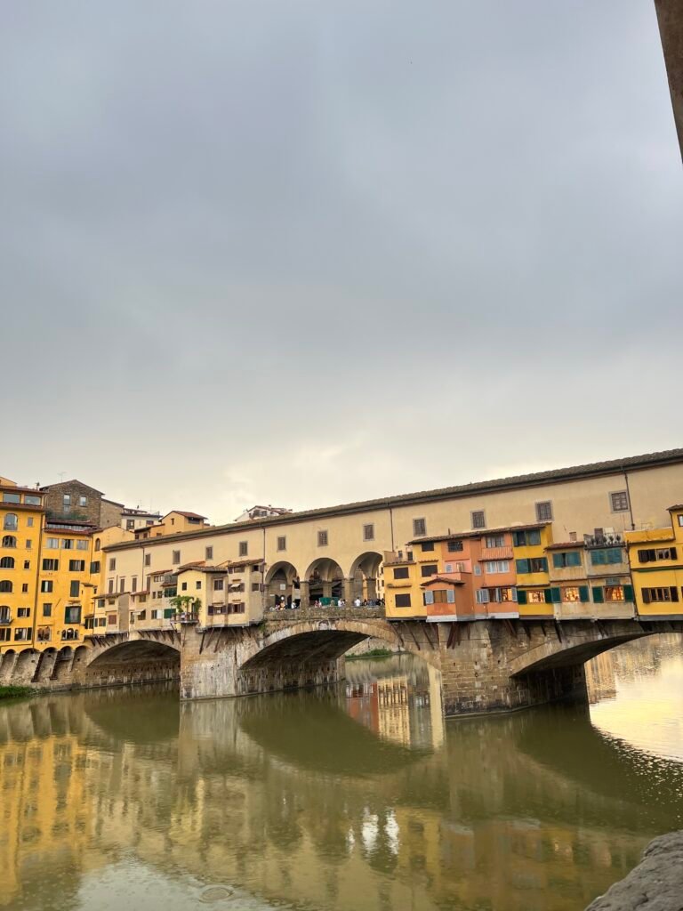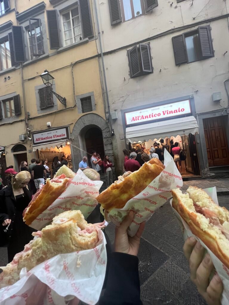 Afternoon: Wander around Florence! Grab some lunch at the most delicious sandwich shop, All’Antico Vinaio. Stroll across Ponte Vecchio, the oldest bridge in Florence, with its unique shops and jewelers. Make sure to find a Wine Window to experience the charm and magic of Florence.